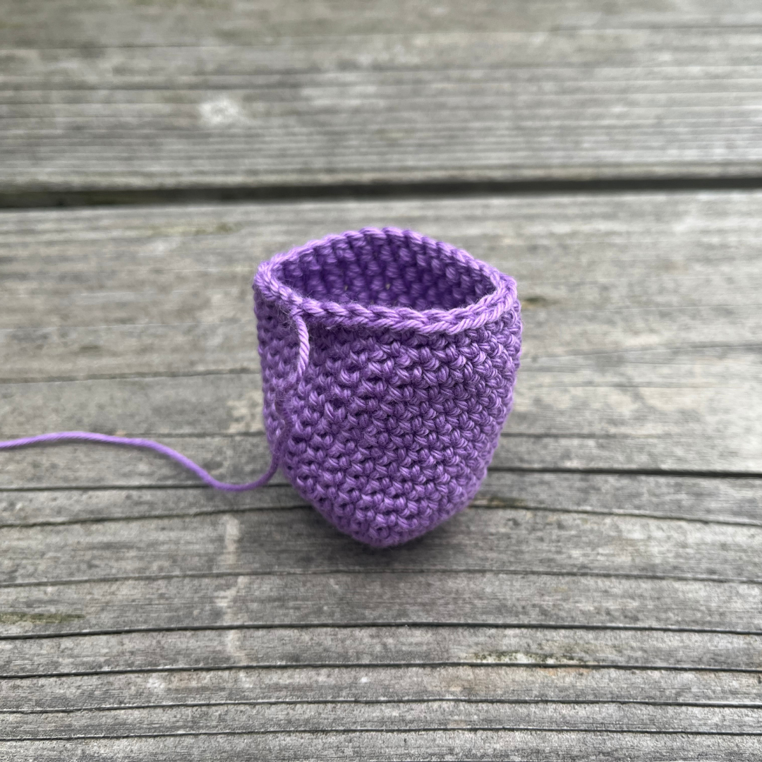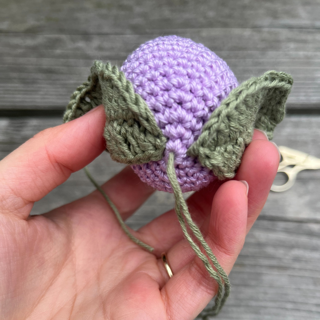 Het wegwerken van draadjes bij amigurumi is erg eenvoudig. Je steekt de draad dwars door het werk heen en trekt de draad naar buiten. Dan knip je de draad simpelweg af en de draad verdwijnt ergens middenin het ‘lichaam’ van de tulp. Door de vulling heeft de draad grip aan de binnenzijde en zal het niet losraken.