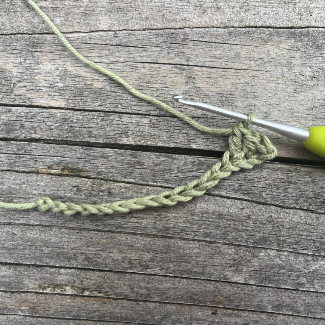 1) Begin in 2e l van de naald. 1v, 1hst, 1st, 10dst, 1st, 1hst, 1v (16 steken total)