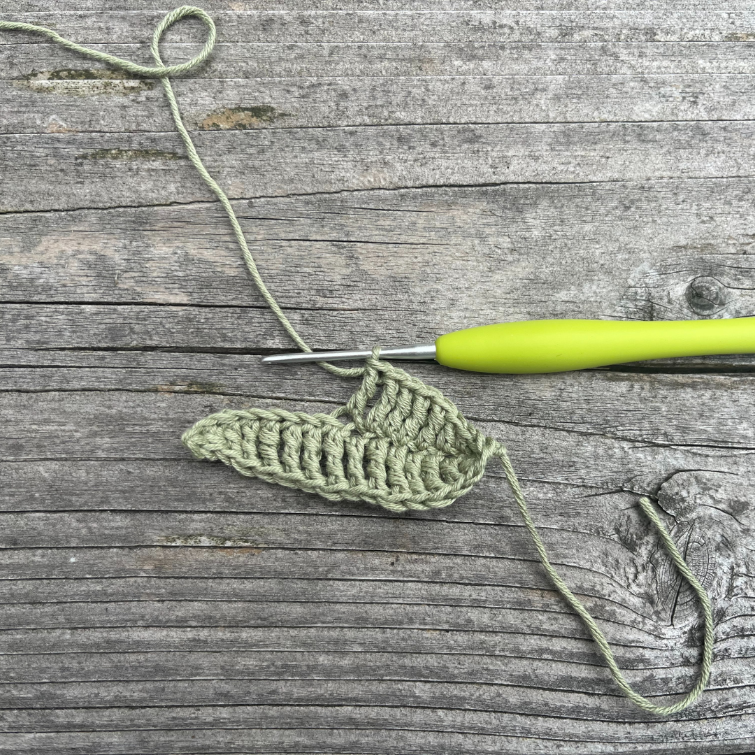 2) Ga verder aan de andere kant van de losseketting. Haak 1v, 1hst, 1st, 10dst, 1st, 1hst, 1v. Hecht af en knip de draad.